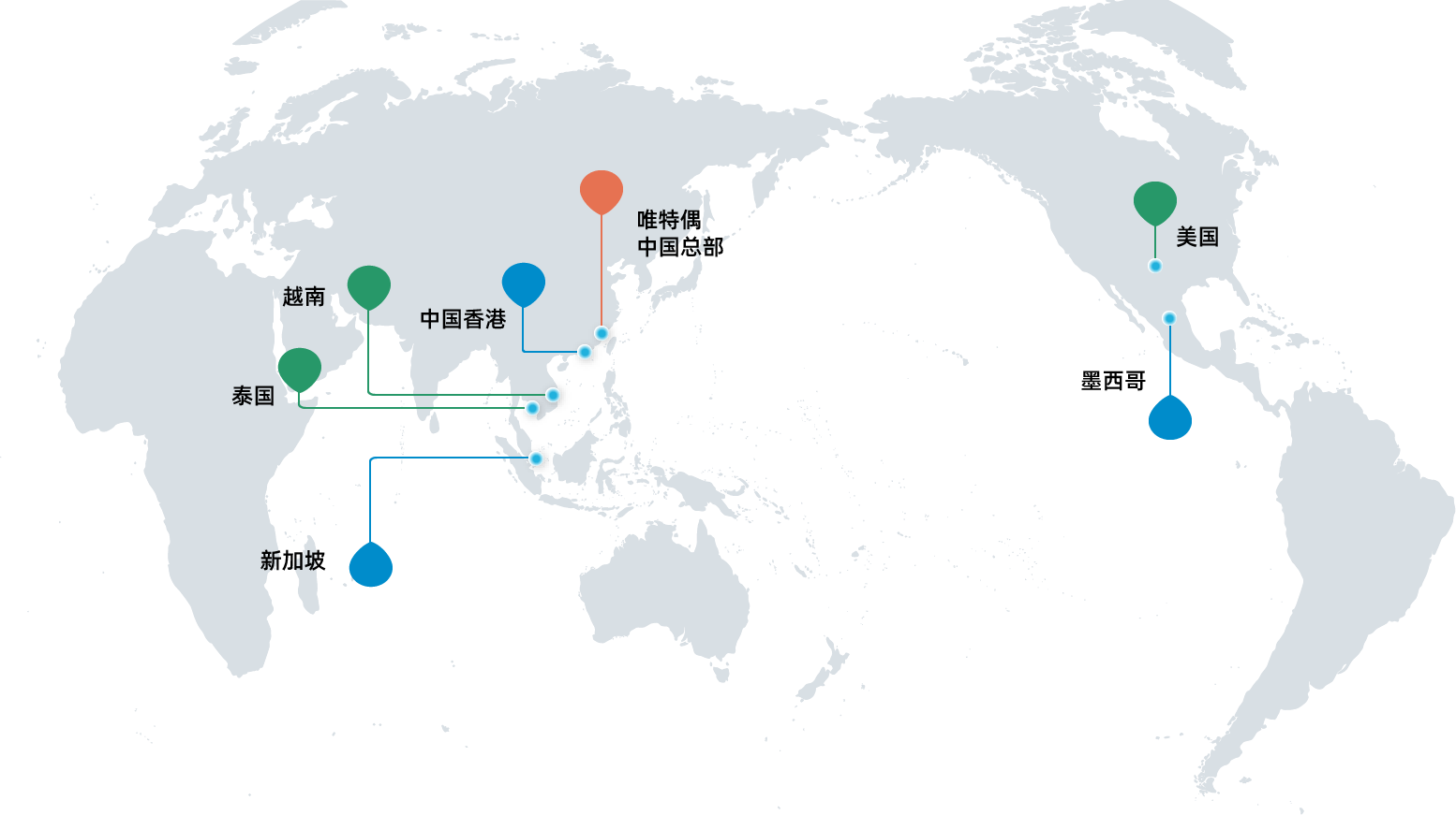 唯特偶立足深圳,服务网络(公司/办事处/中转仓库等)遍布全球。