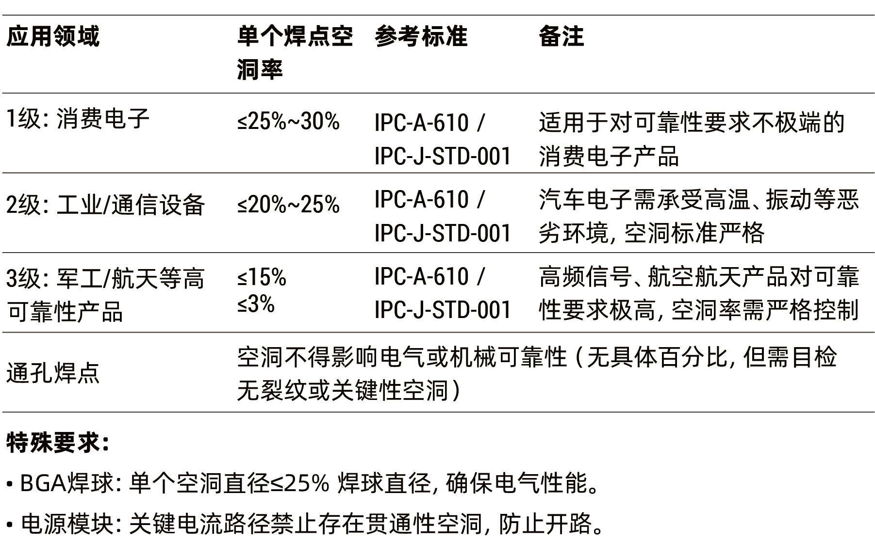 不同行业对焊接可靠性的要求差异显著(通用标准如上图),唯特偶低空洞锡膏可精准匹配各领域的参考标准,满足从消费电子到军工航天的全场景需求: