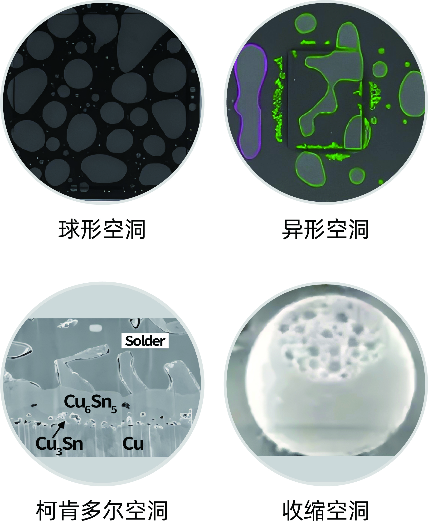 1. 根据形态与形成机制,可将空洞分为四类:球形空洞、异形空洞、柯肯多尔空洞、收缩空洞。
