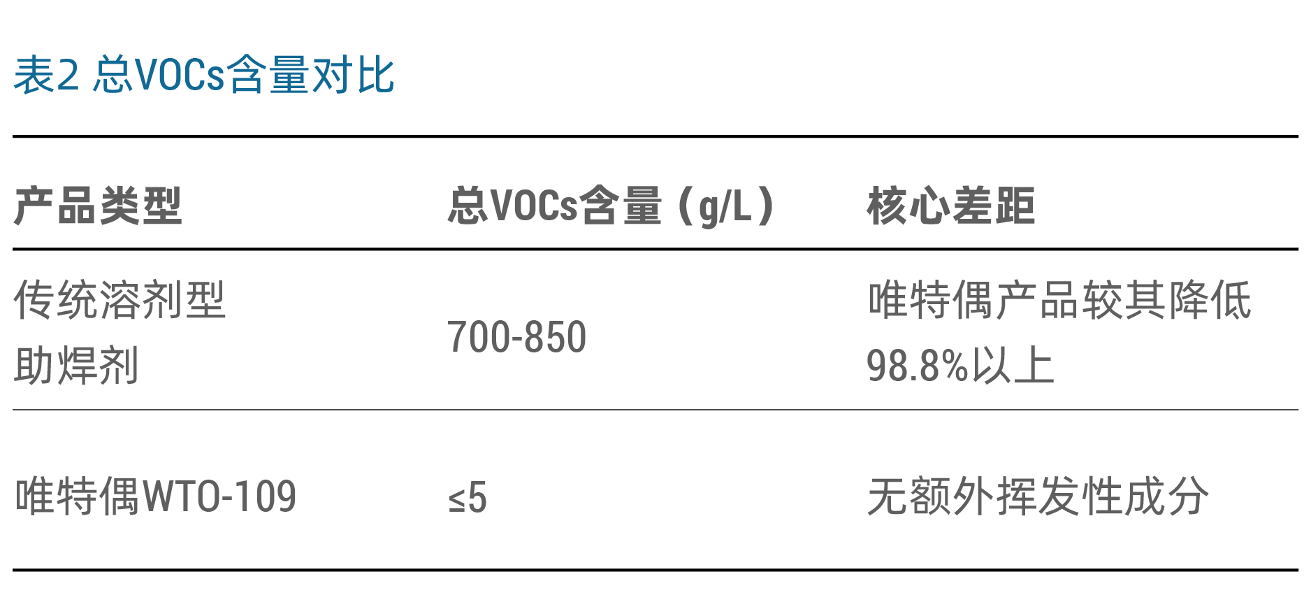 在环保政策趋严与市场绿色需求的双重驱动下,助焊剂行业的VOCs含量水平已成为企业核心竞争力的关键指标之一。唯特偶系列助焊剂产品展现出突出的环保优势,其中WTO-109无额外VOCs 挥发性成分,环保性能优于行业普遍水平,助力企业在环保合规、成本控制与市场竞争中抢占先机。