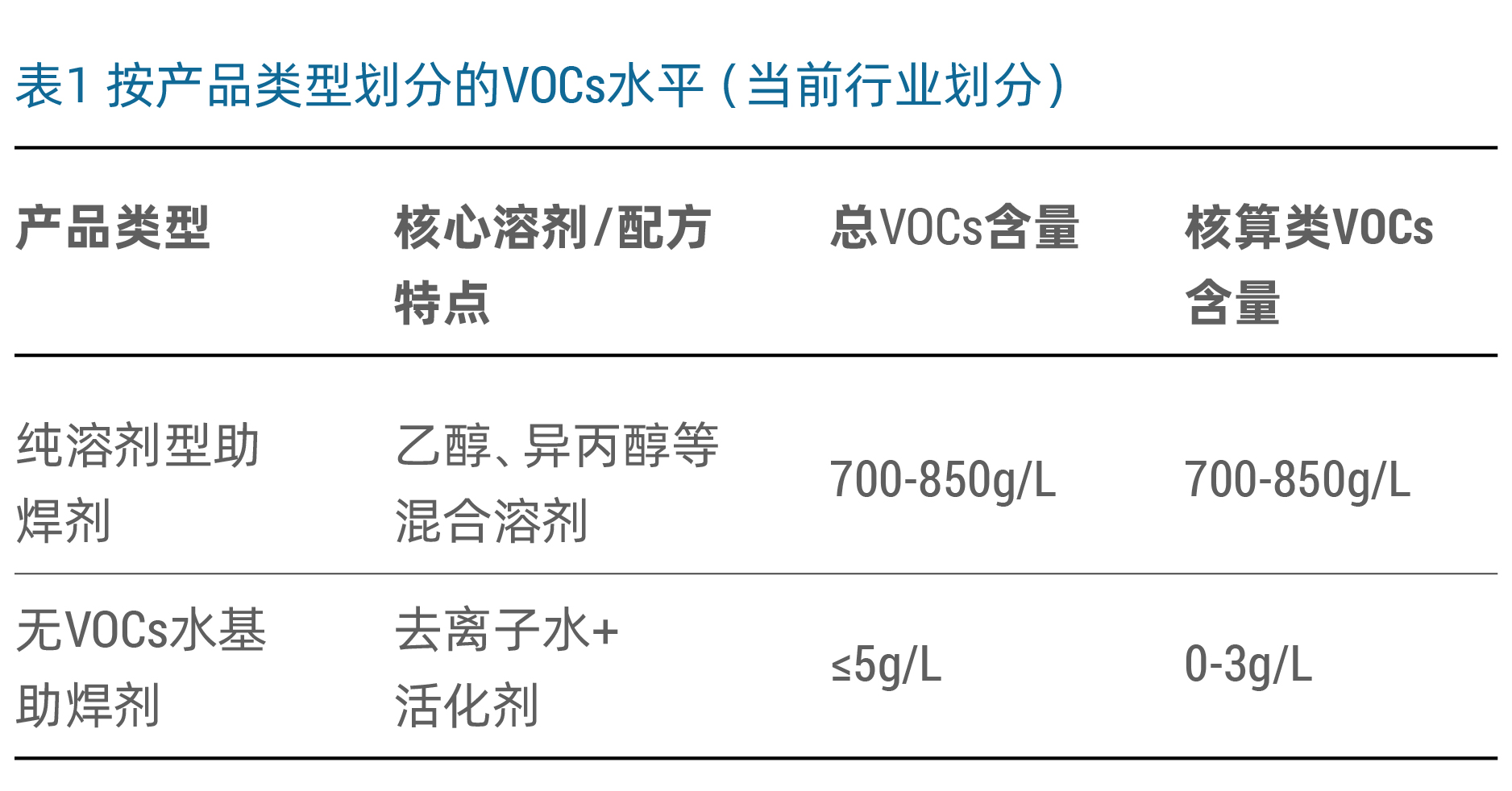 然而受配方设计、工艺、产品可靠性等因素影响,当前助焊剂行业 VOCs 排放水平因产品类型不同呈现明显分层。传统高 VOCs 产品多以低沸点的异丙醇、乙醇等为主成分,其仍占据一定市场份额,这与无 VOCs 产品形成鲜明对比。