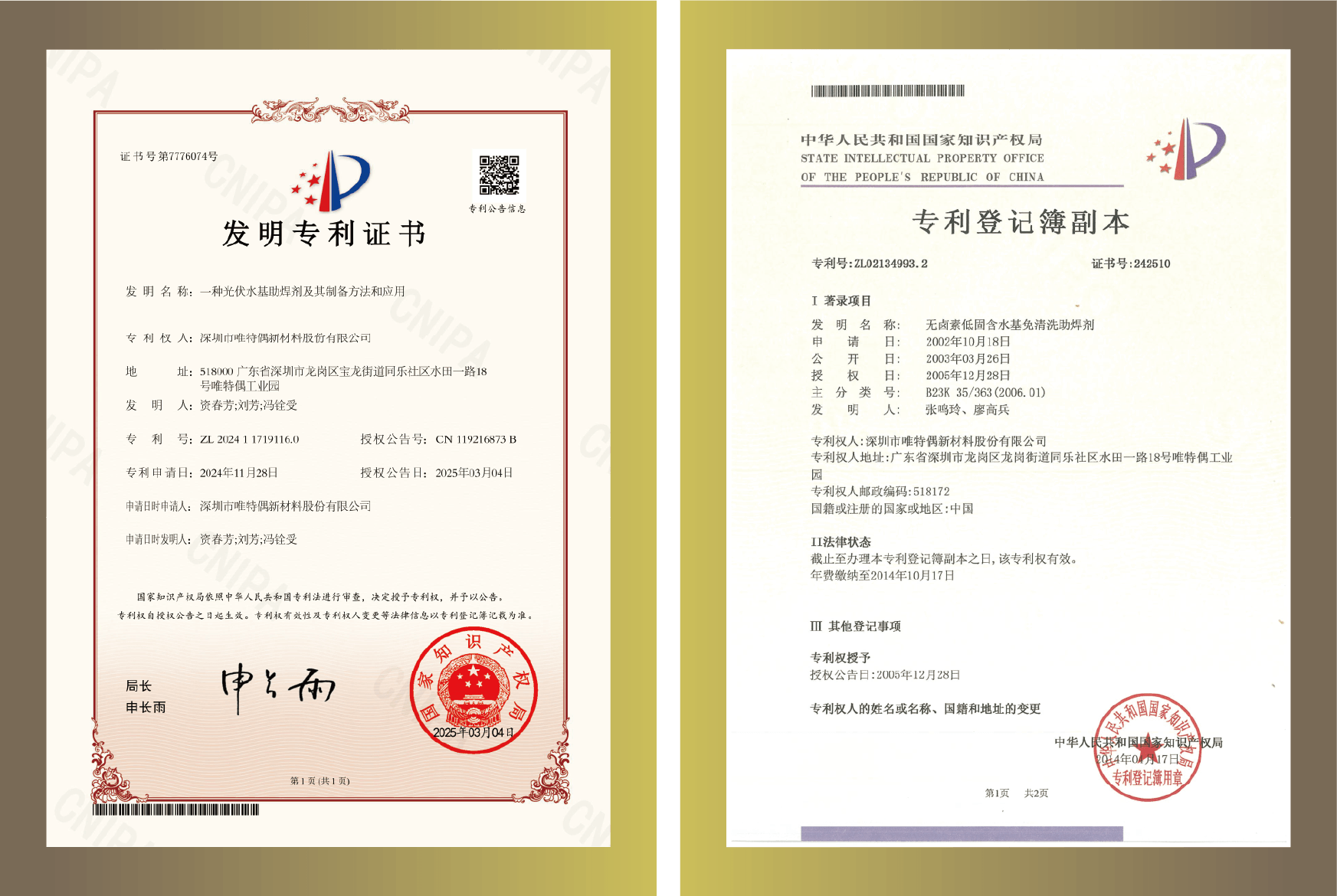 核心专利:2项发明专利授权(含ZL2024 1 1719116.0一种光伏水基助焊剂及其制备方法和应用),构建技术壁垒。