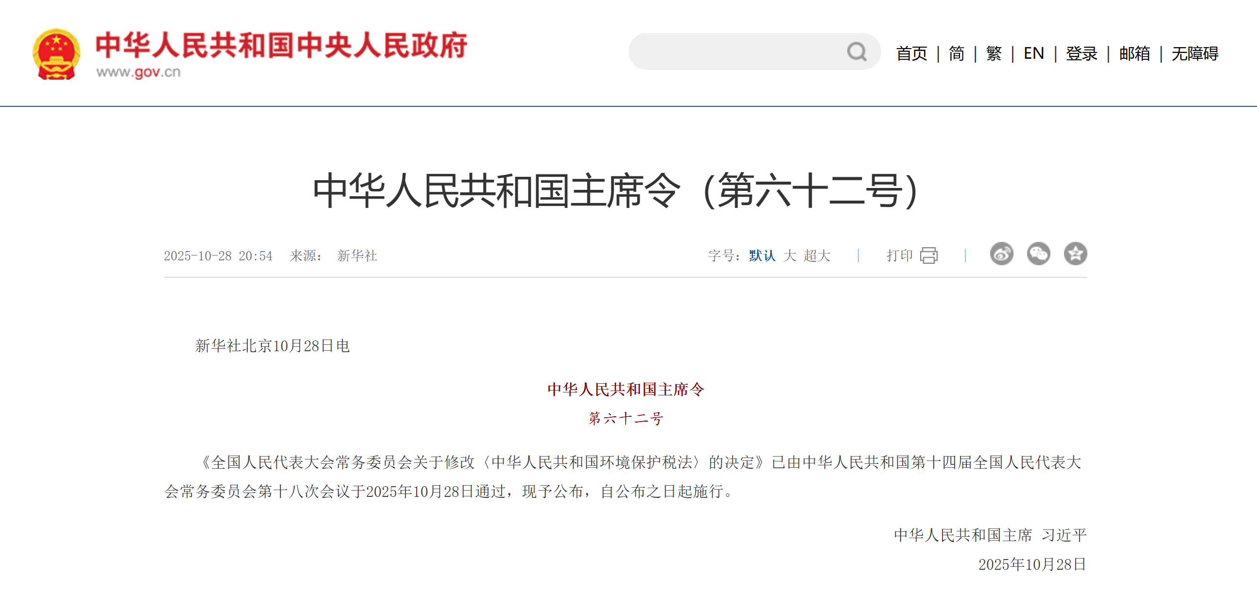 重磅!六十二号主席令:《中华人民共和国环境保护税法》新增VOCs征税试点,税收杠杆直接倒逼企业减排!